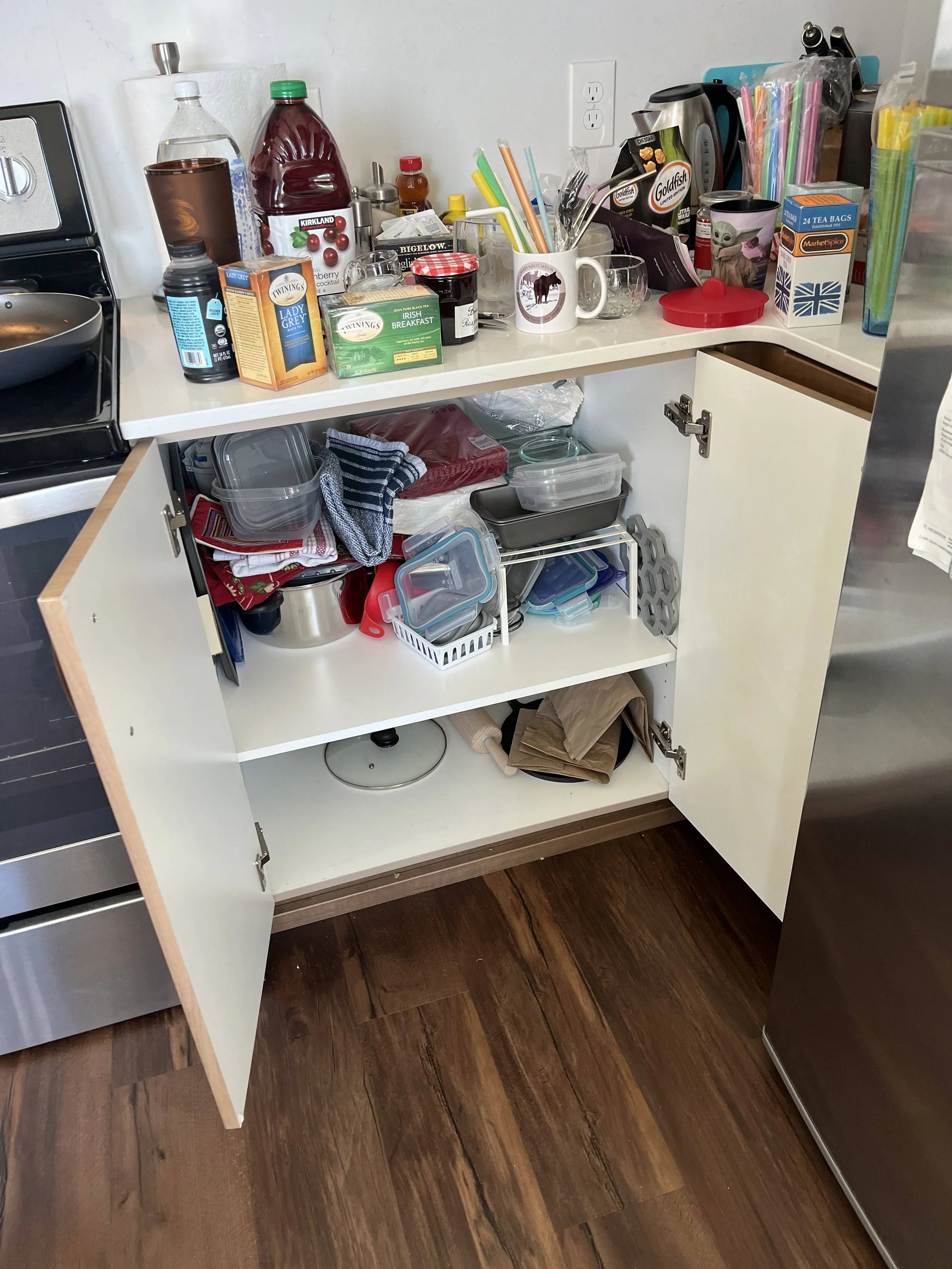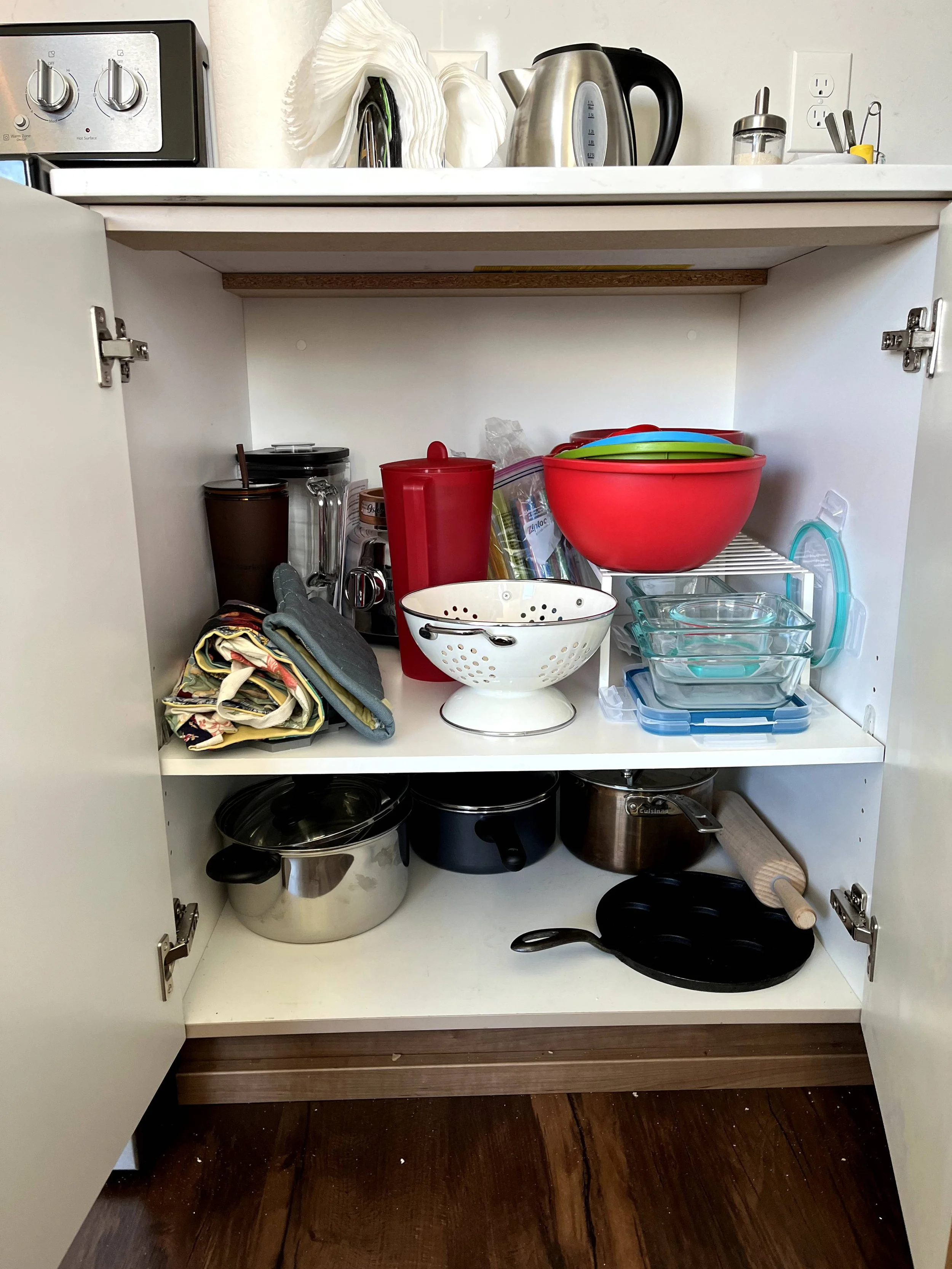 We worked together to declutter and dispose of things they did not want, relocate food stuff to a different cabinet, and put their most used items front and center for ease of use. This enabled the client to feel more comfortable in their temporary space.